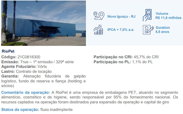 Breve descrição: CRI Corporativo da empresa RioPet, que é o principal fornecedor nacional de embalagens Pet do Brasil, sendo responsável por 95% da demanda brasileira.